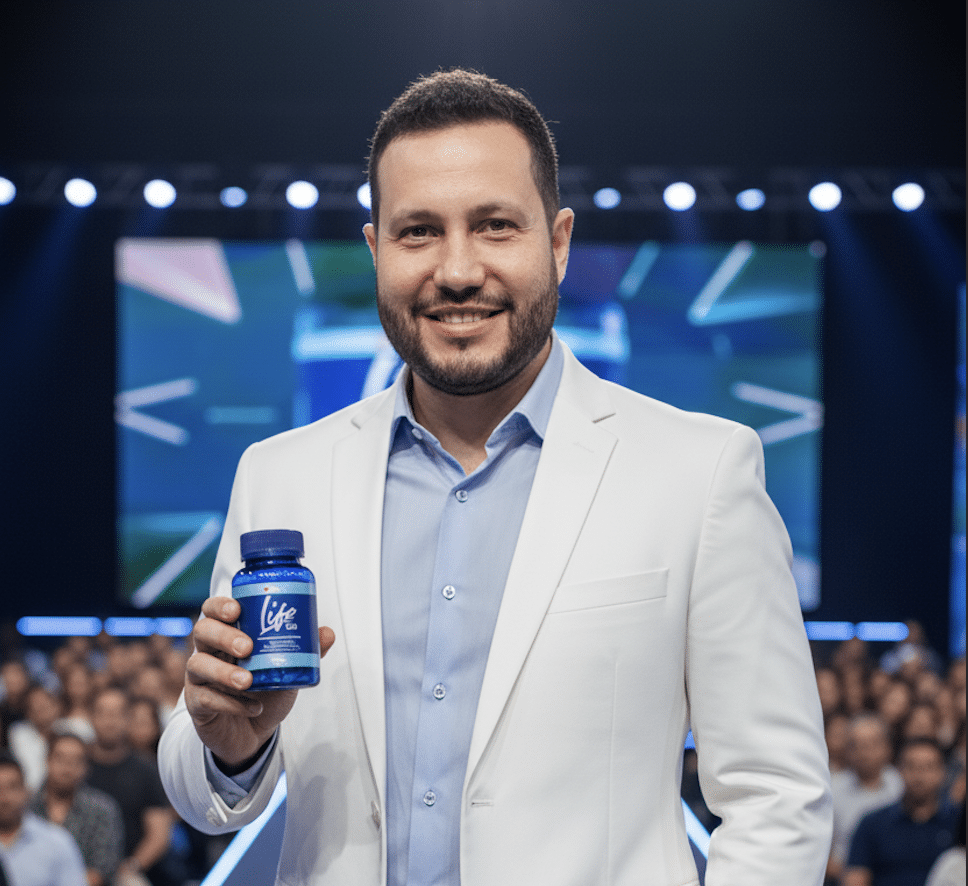 A confiança no mundo da saúde não se vende apenas por lives. O produto físico gera uma conexão de autoridade imediata, inigualável por qualquer promessa digital.